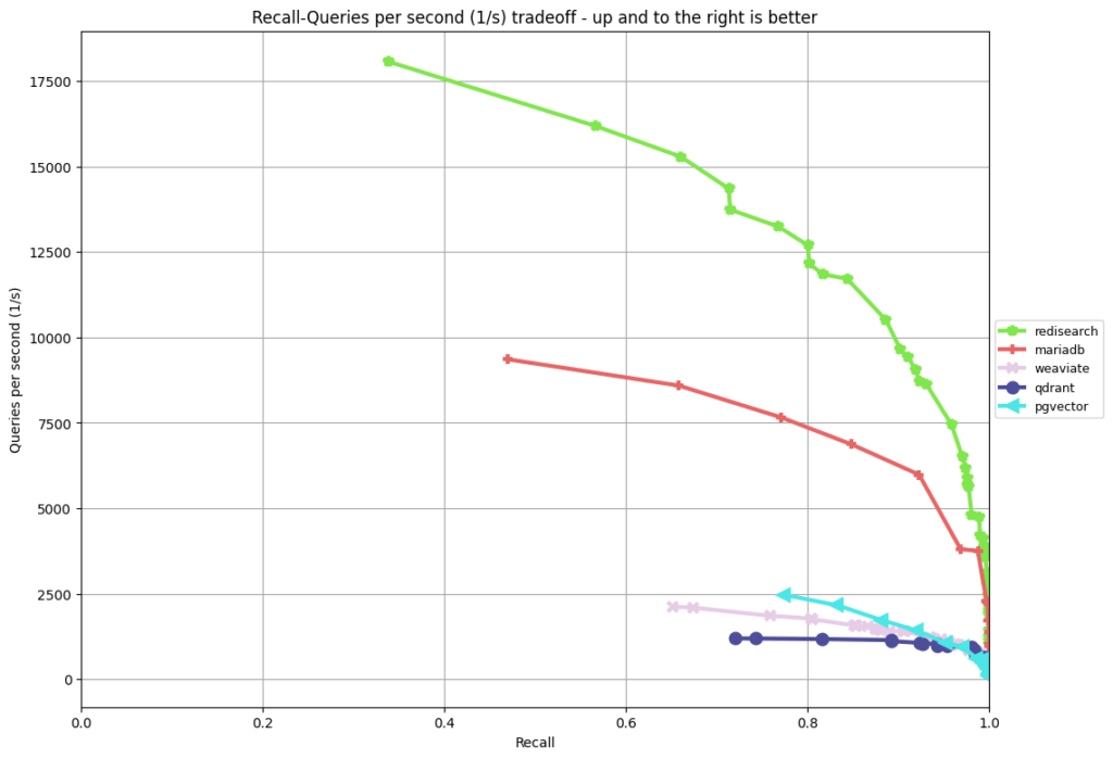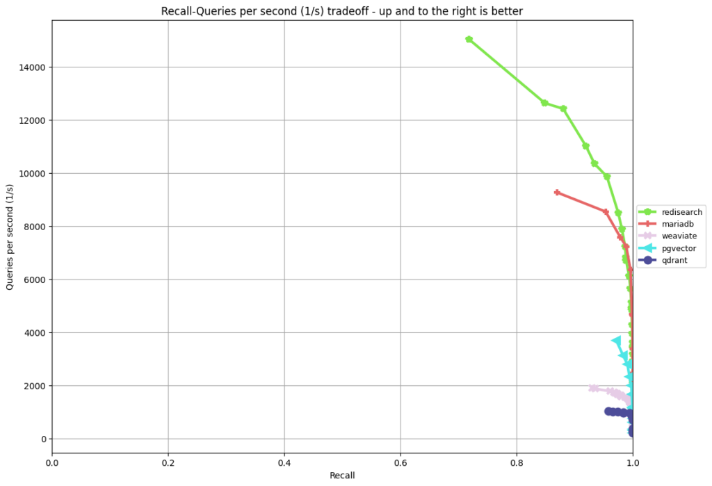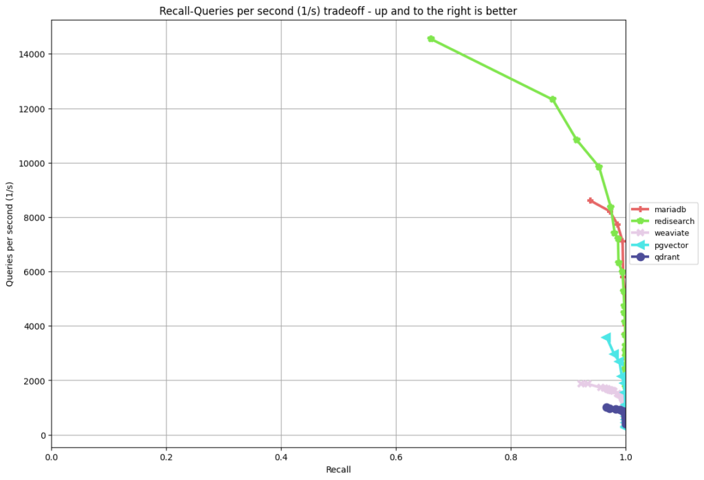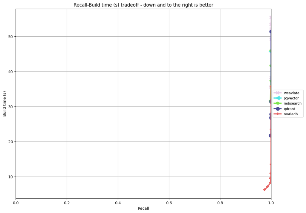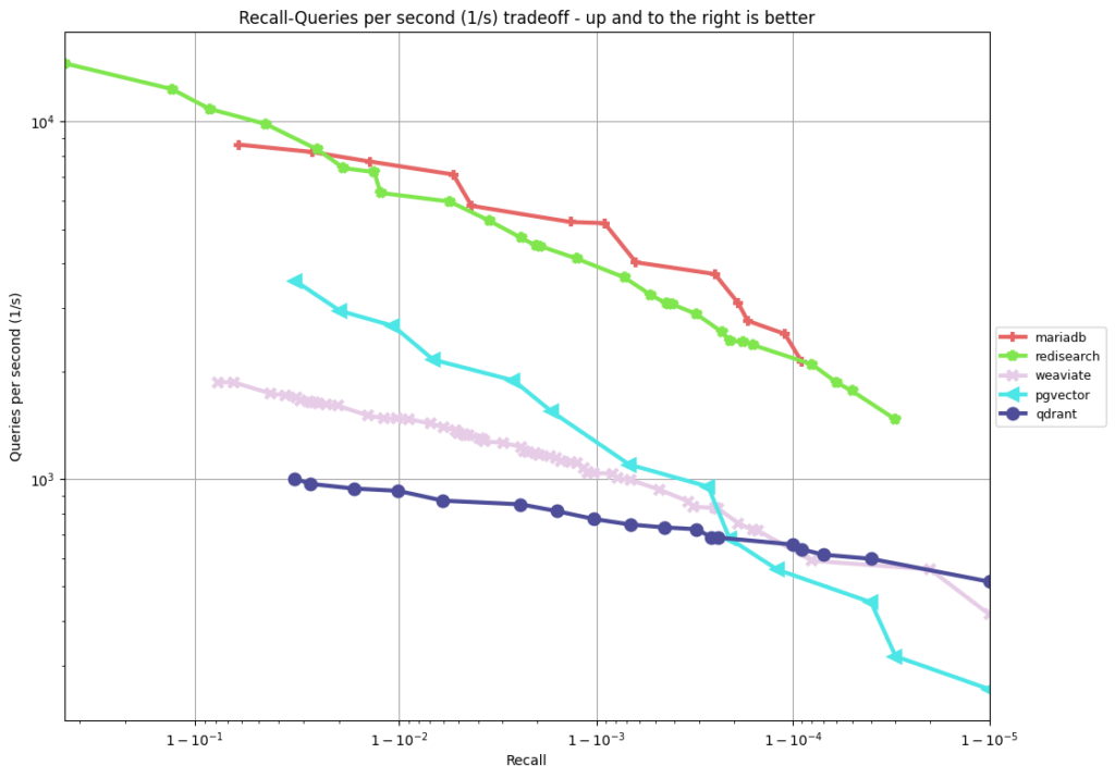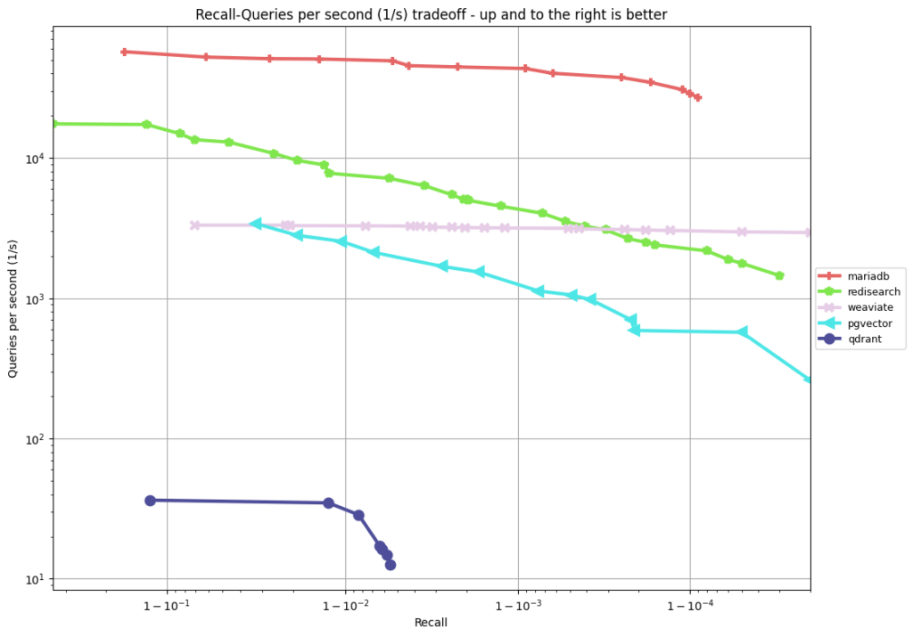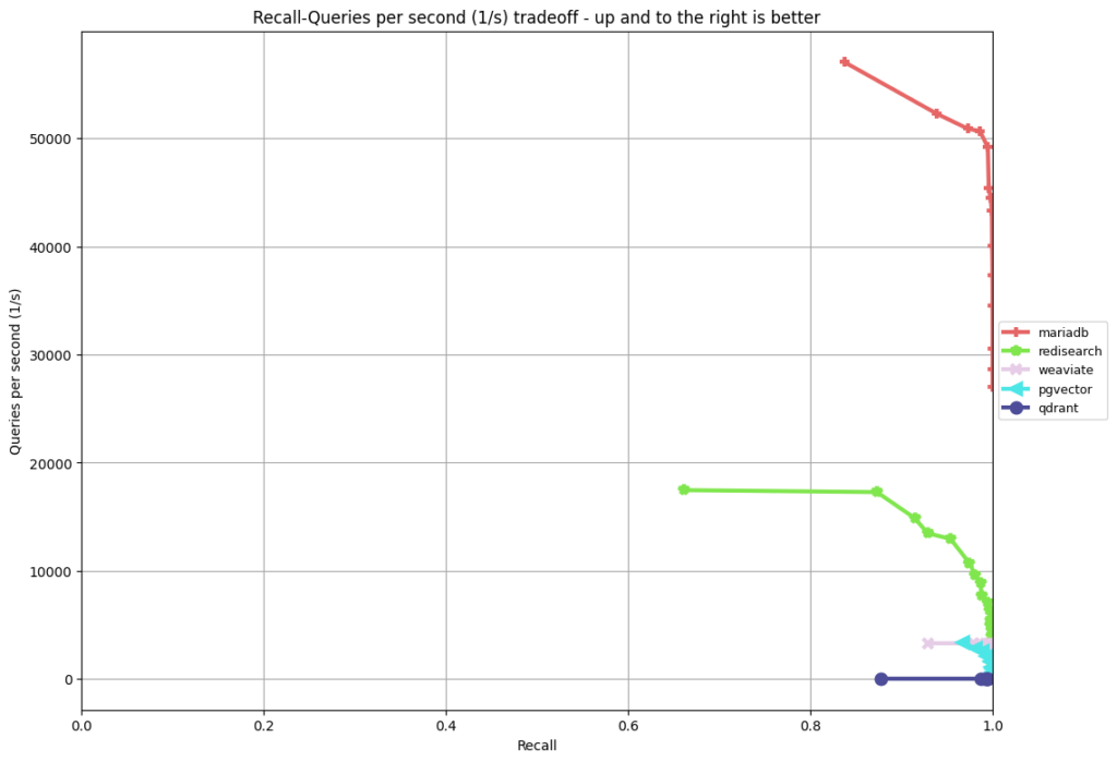 Concurrency results are baffling. It’s hard to imagine that all tested databases are that bad at scaling. I’d rather shrug it off as some bug in the corresponding python module for a specific database. On the other hand, it’s almost as difficult to believe that they all, except for MariaDB, have this bug in their python modules. Perhaps, developers familiar with these databases could take a look at ann-benchmarks batch mode and explain the bad scalability results. One is clear, though, MariaDB Vector scales nicely and many concurrent connections can search the vector index in parallel significantly improving the throughput.