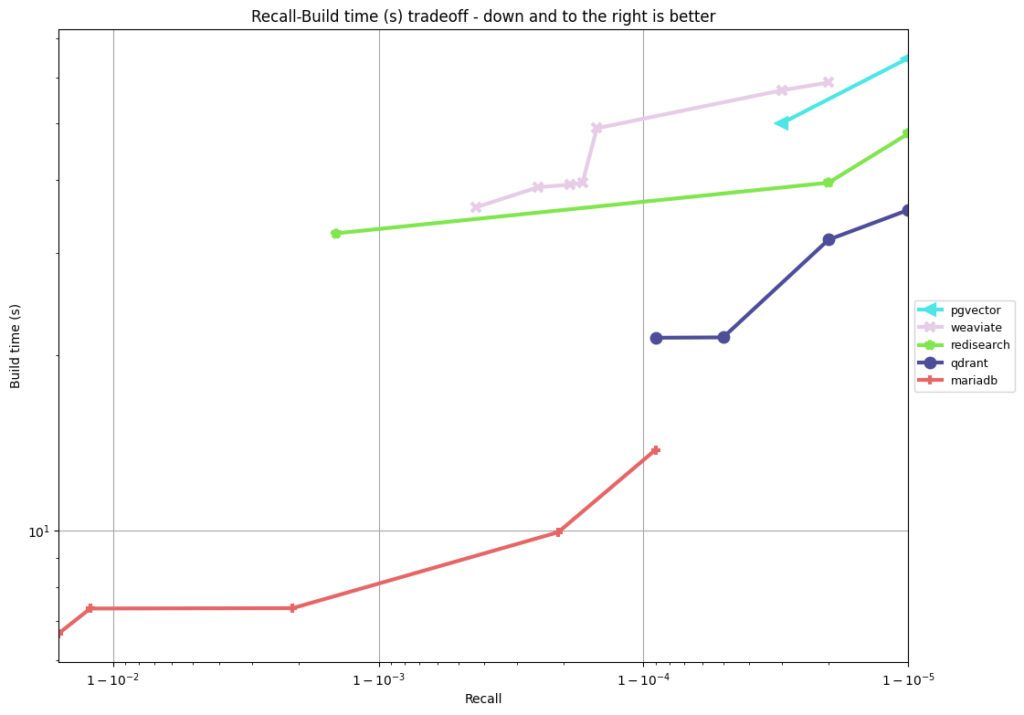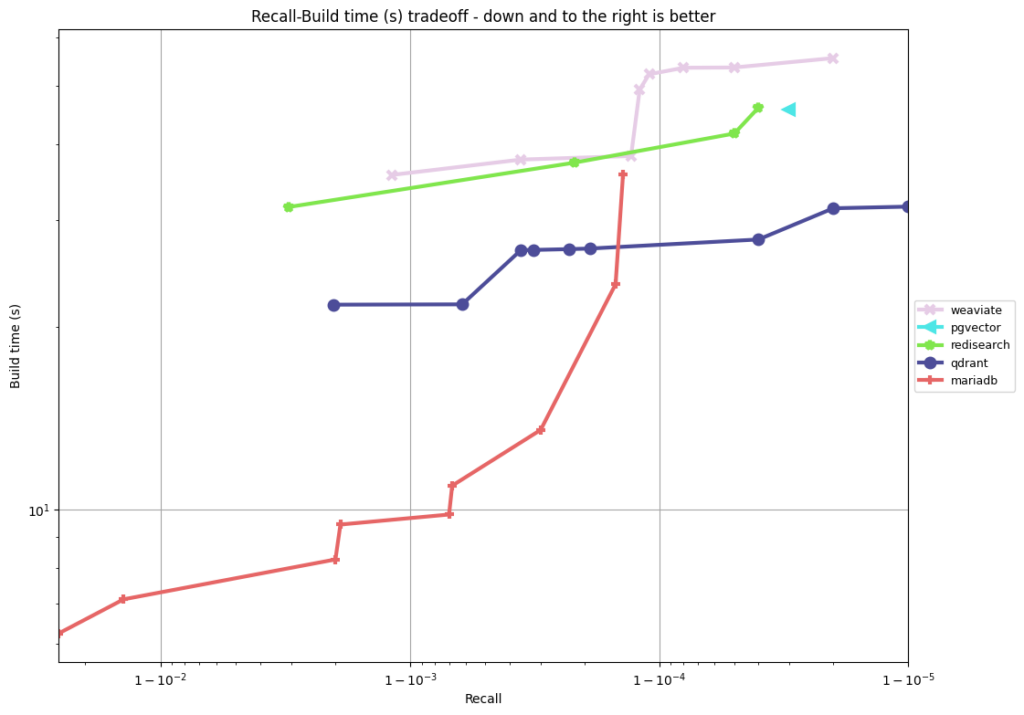 MariaDB Vector shows a very competitive performance. It demonstrates the highest qps for a given recall on smaller datasets, with RediSearch being the second, and on large datasets MariaDB Vector comes a close second after RediSearch. On the other hand, MariaDB Vector builds an index faster than RediSearch. Interestingly enough, specialized single-purpose vector databases didn’t turn out to be much faster. They search worse than both MariaDB Vector and RediSearch. And except for Qdrant on the GIST dataset the indexing time isn’t better either.