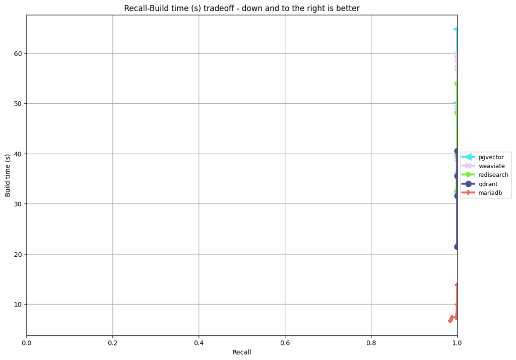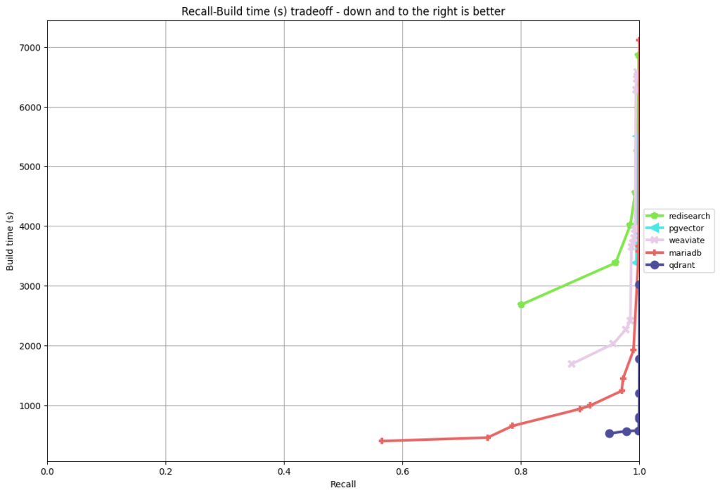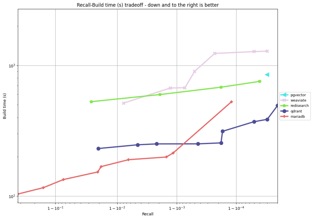 All plots were created by the ann-benchmarks plot.py tool. It plots the index build time or the qps against the recall. The search is always approximate (“ann” in “ann-benchmarks” means Approximate Nearest Neighbor), and recall shows how close the result is to the exact search. If the recall is 1 — the search is exact. You can roughly think of the recall of 0.99 as when you do SELECT … LIMIT 100, you can have one row which is different from the exact result you would’ve got with a full table scan. Because everything — recall, build time, qps — heavily depends on the index and search parameters, ann-benchmarks automatically tries various combinations of them, as instructed by the configuration file, and selects the best result. Meaning, the qps-vs-recall plot, for example, shows the best qps one could get for a given recall.