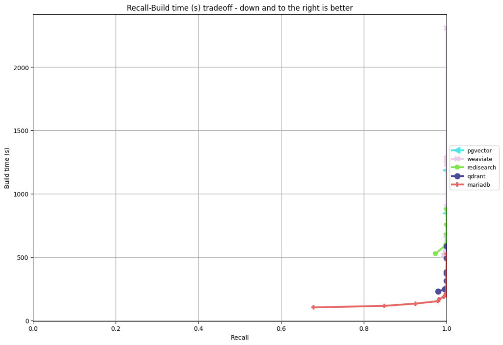 This is the time from the point when a table is empty, to the point when a vector index is completely built. Many vector databases insert the data first and then build the index. As of today, MariaDB Vector does not support that yet, we build the index slowly, as the data is inserted, row by row.