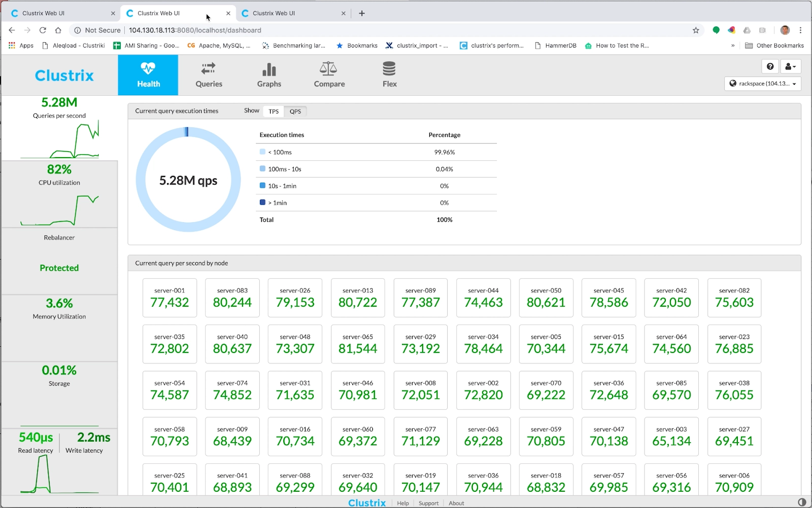 Last September, MariaDB acquired Clustrix for its distributed database technology. With ClustrixDB, if your application needs more scale from the database, it’s as simple as adding more nodes. At the MariaDB OpenWorks 2019 Conference in New York, we put that claim to the test. With the generosity and support of Rackspace, we demonstrated a live cluster running over 5.2 million queries per second (QPS) in sustained throughput using a 90:10 read/write transactional workload.