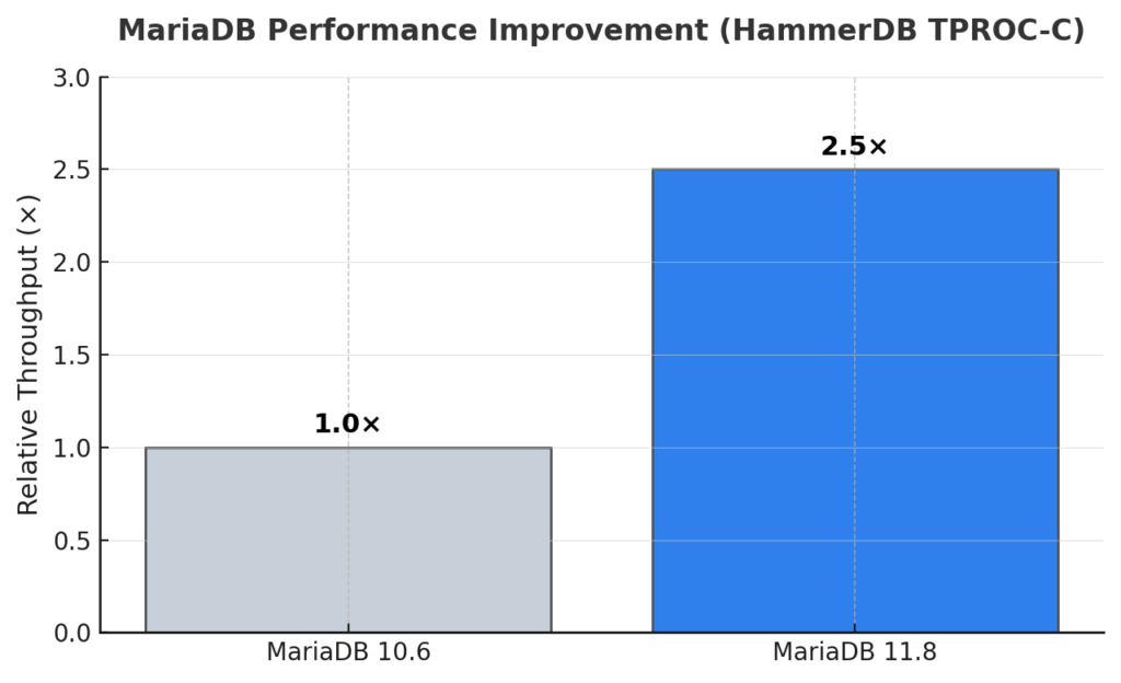 MariaDB 11.8 converts low-level engineering improvements directly into measurable performance gains. The server now scales efficiently across the full parallelism of modern AMD EPYC processors and high-bandwidth NVMe storage, sustaining millions of transactions per minute under HammerDB workloads.
