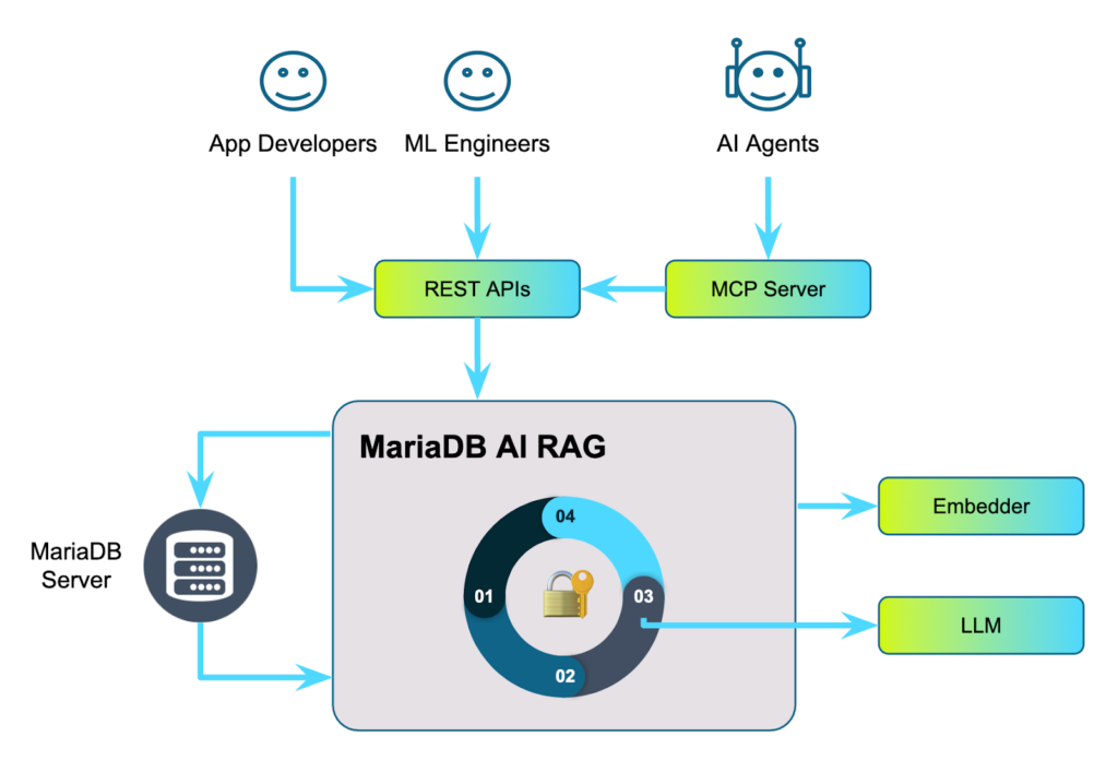 MariaDB AI RAG is an independent process (microservice) that can be scaled both vertically and horizontally, and that lives next to your MariaDB server (or cluster) and AI models. It exposes all its functionality through a set of APIs that application developers and machine learning engineers can use to build their own applications and solutions. It can also be used with the Enterprise MCP Server to allow AI agents to invoke RAG functionality.