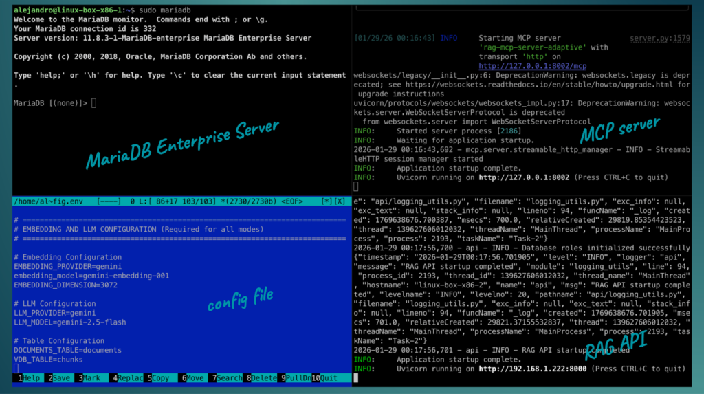 - and a VM running MariaDB AI RAG with a custom config file where I set the AI models to use, database connection, and other configurations.