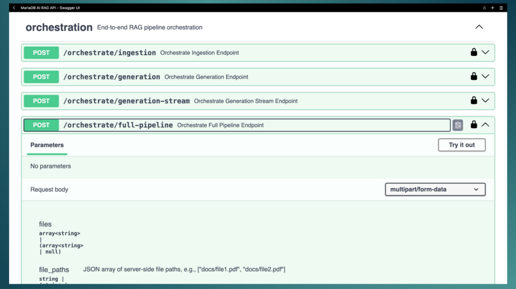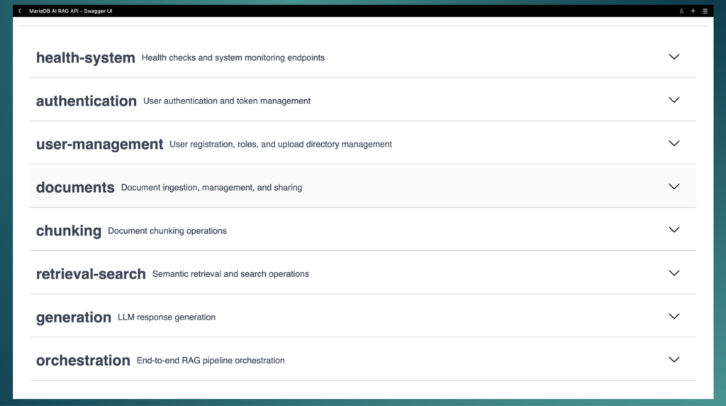 MariaDB AI RAG provides a Swagger UI instance so you can test and explore the REST API in a browser. However, you can use any tool and any programming language or even curl to invoke the REST endpoints. Here are the available APIs: