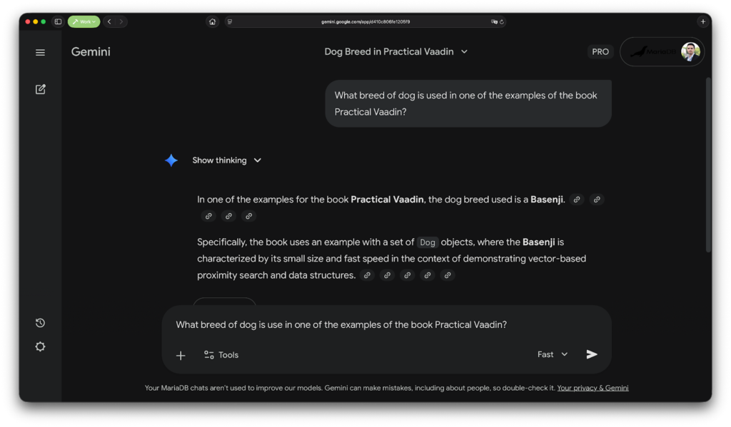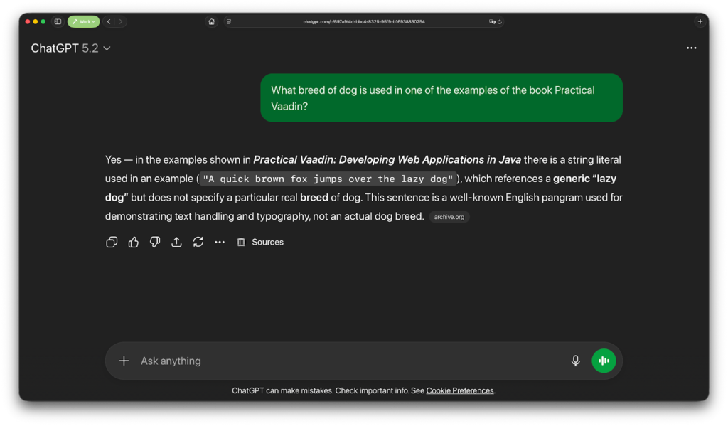 And for this, I decided to use one of my books and ask a question that a pretrained model without RAG wouldn’t be able to answer correctly. In this book, I mention a dog. If I use ChatGPT to find more details about this dog, I get the following: