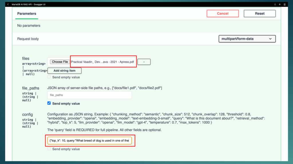For the book example, invoking the orchestrate/full-pipeline is as simple as uploading the PDF file, (optionally) setting a value for top_k (the number of similar chunks to retrieve), and specifying the query (the question about the dog):